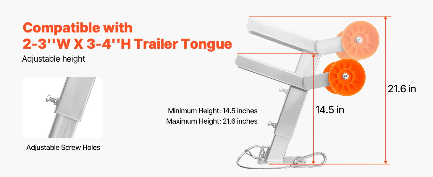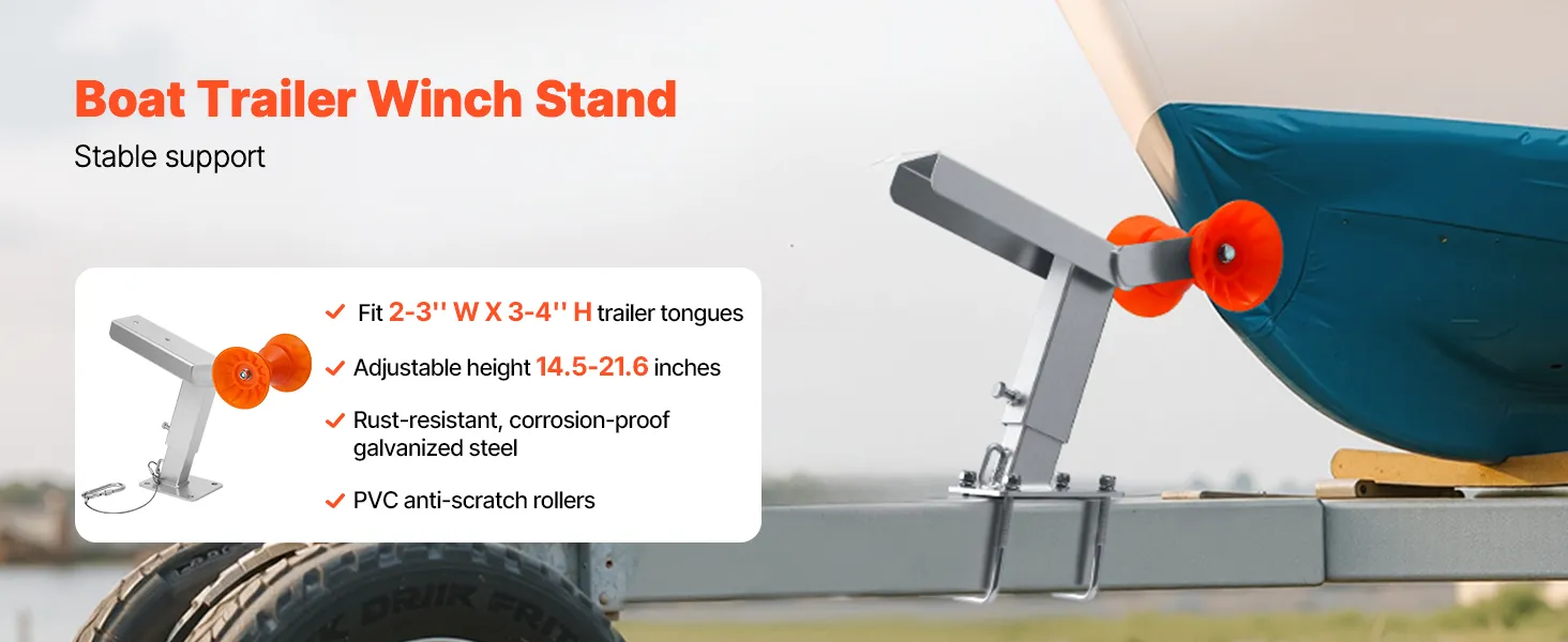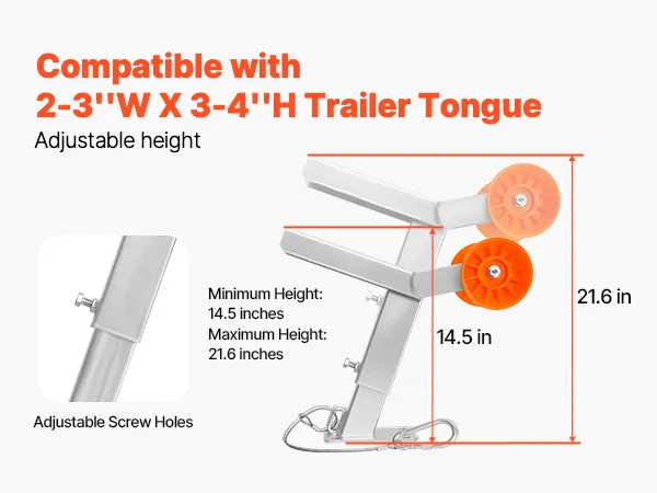 Our boat trailer winch stand greatly matches 2-3'' W x 3-4'' H trailer tongues. Simply adjust the screw holes to set the height between 17.3 to 21.6 inches. It’s flexible, easy to adjust, and perfectly suited for a variety of transport needs.