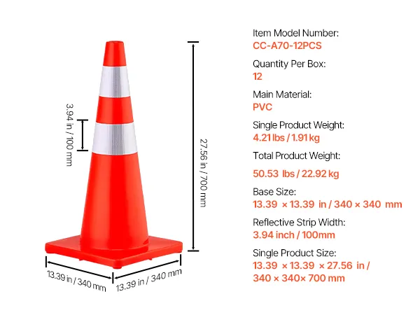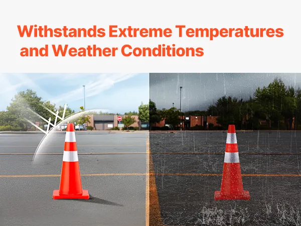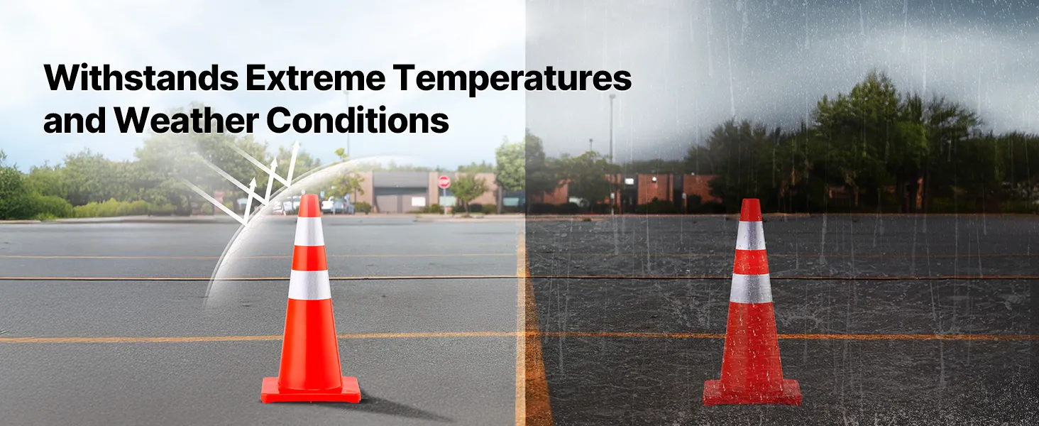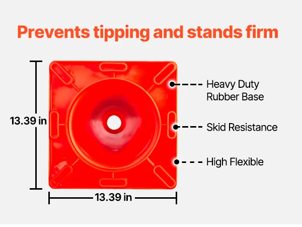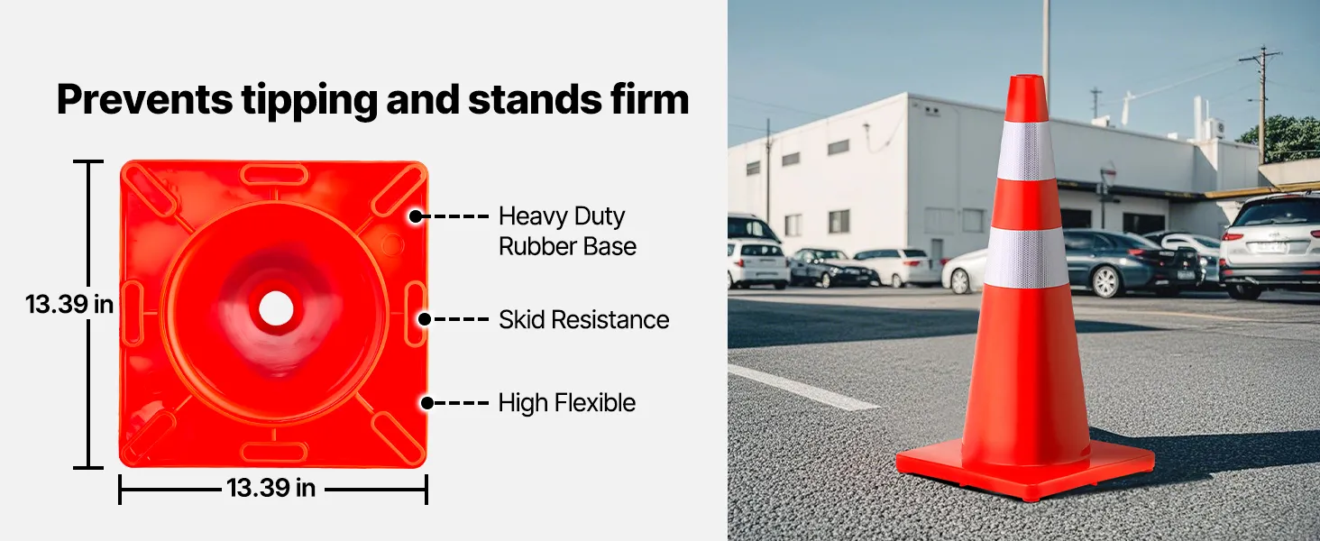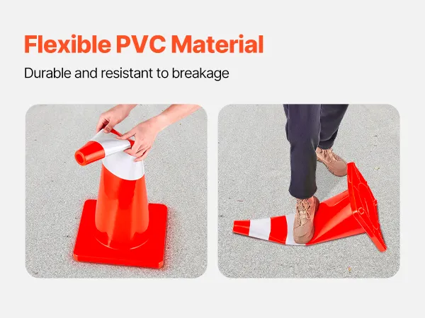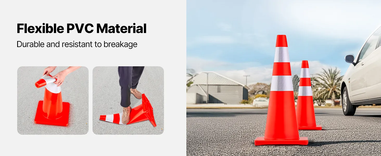 The cones are made of high-quality and dense PVC material. These cones withstand harsh weather conditions. Their design allows them to function effectively in challenging environments. Their heavy-duty design allows them to withstand heavy impact, ensuring their long-term use. Additionally, the material is flexible, providing some give when struck. This makes them safer to use around people and animals. They remain upright and visible at all times.