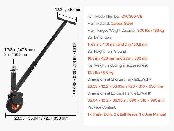 Universal Fit: Featuring 1-7/8-inch and 2-inch ball diameters and height adjustments of 16.5 inches and 22 inches, our adjustable trailer dolly is designed to accommodate trailers of different sizes effortlessly. Easily adapt to your trailer or boat with simple adjustments
