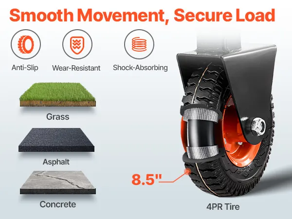 Stable Movement: Equipped with an 8.5-inch pneumatic rubber tire, our trailer mover dolly provides excellent traction and stability on smooth cement roads, grass, uneven terrains, and sandy surfaces. The tire is also wear-resistant and shock-absorbent, providing a comfortable and safe towing experience