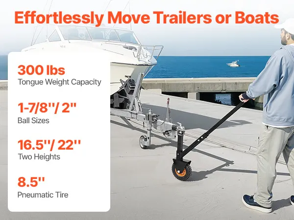 Choose between 1-7/8 in or 2 in ball sizes and select from 16.5 in or 22 in height adjustments. This trailer mover dolly is compatible with most couplers and various trailer sizes, providing seamless adaptability for your trailer or boat.