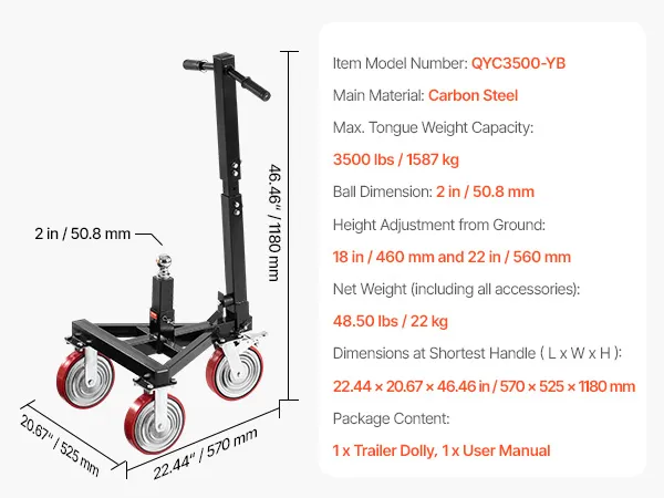 High Load Capacity: This trailer dolly supports an impressive 3,500 pounds. Constructed with high-strength carbon steel and finished with a powder-coated surface, it is sturdy, durable, and resistant to rust and corrosion. Perfectly handles towing various heavy-duty trailers and boats, making your moving process smoother and more effortless