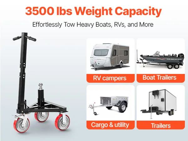 This trailer mover dolly has a load capacity of 3,500 pounds and is constructed from high-strength carbon steel for rust resistance and durability. It is suitable for a variety of vehicles, including RVs, trucks, barbecue trailers, and boats.