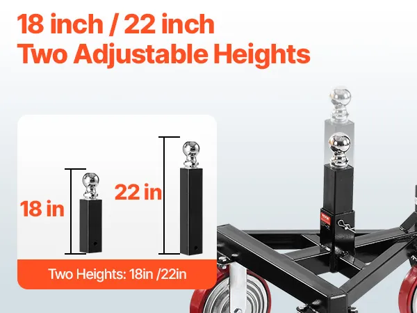Equipped with a 2-inch hitch ball, this trailer mover dolly is compatible with most couplers. Choose between two adjustable height settings of 18 inches or 22 inches to accommodate trailers of varying sizes.