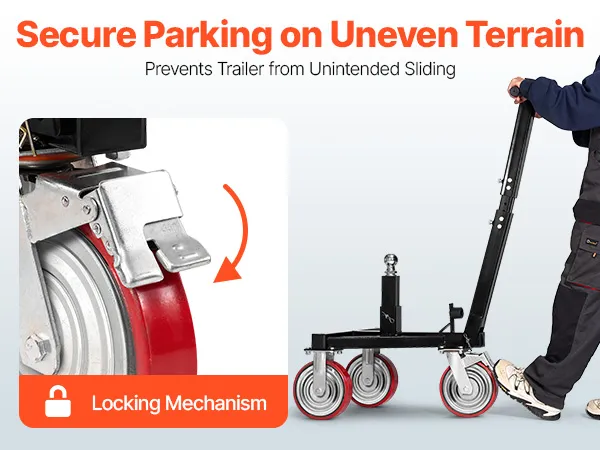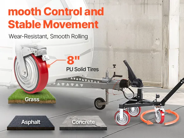 Swivel Wheels with Brakes: The trailer mover dolly is equipped with 8-inch solid PU swivel wheels that provide excellent wear resistance and smooth movement on both flat and uneven surfaces such as concrete roads, lawns, and sidewalks. The locking mechanism prevents slipping, allowing your trailer to move flexibly and maintain a stable load under various road conditions