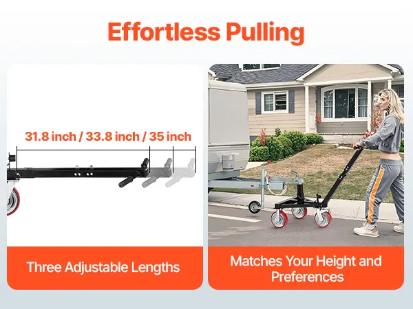 Portable and Easy to Use: Our trailer mover features a three-wheel stable structure combined with height-adjustable handles (31.8 inches, 33.8 inches, and 35 inches) to suit different heights and user needs. The foldable and easy-to-disassemble design allows for effortless storage in your vehicle’s trunk, making it highly portable for all your moving tasks