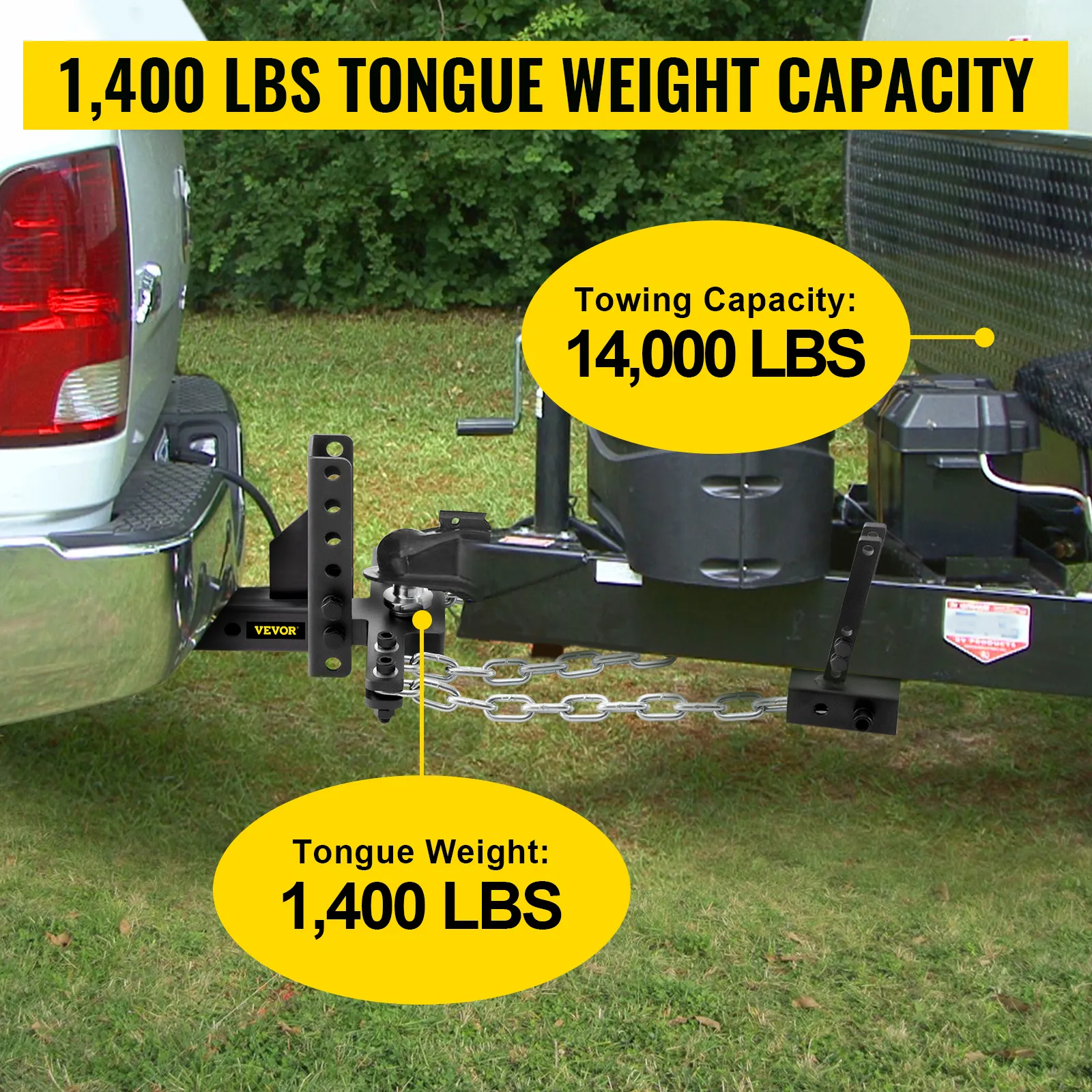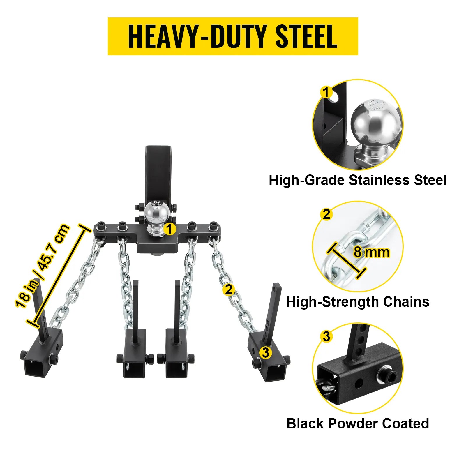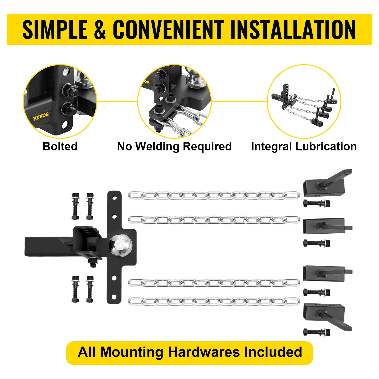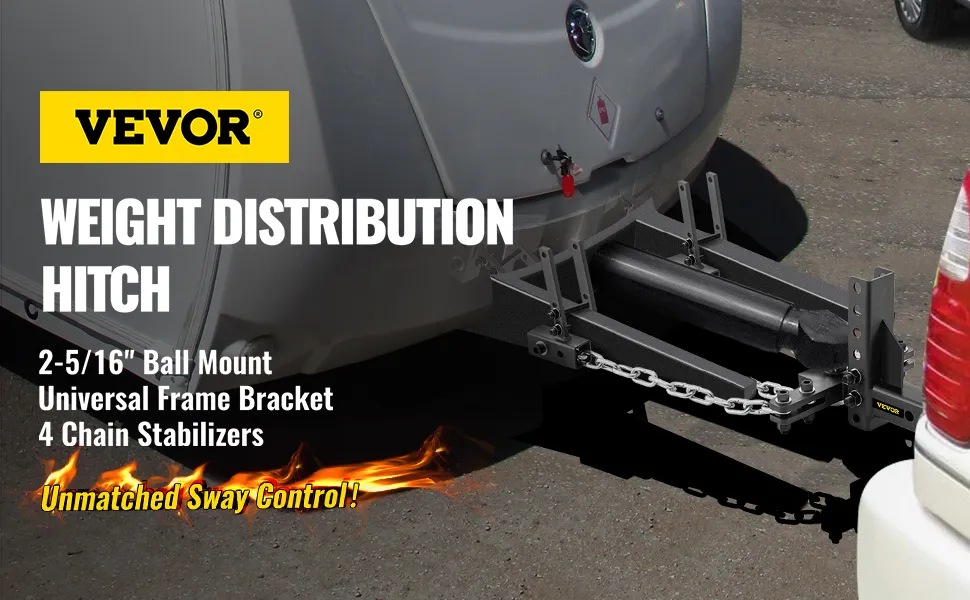 VEVOR's weight distribution hitch is a simple yet advanced connecting hitch designed. 4-chain stabilizers are more stable than double-chain or no-chain stabilizers. No back-off or turning restrictions. It is easy to stop swaying, even in bad road conditions such as ice.