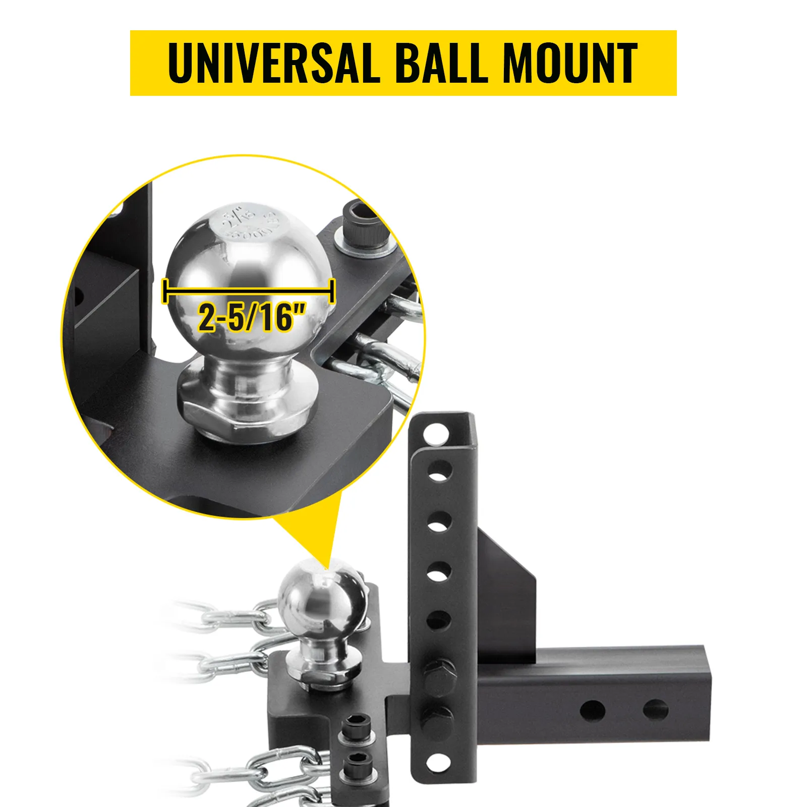 The standard 2-5/16" hitch ball and sway control chains are torqued on the adjustable ball mount hitch receiver. You can adjust the installation height according to your needs. The height adjustment range is 8 inches.