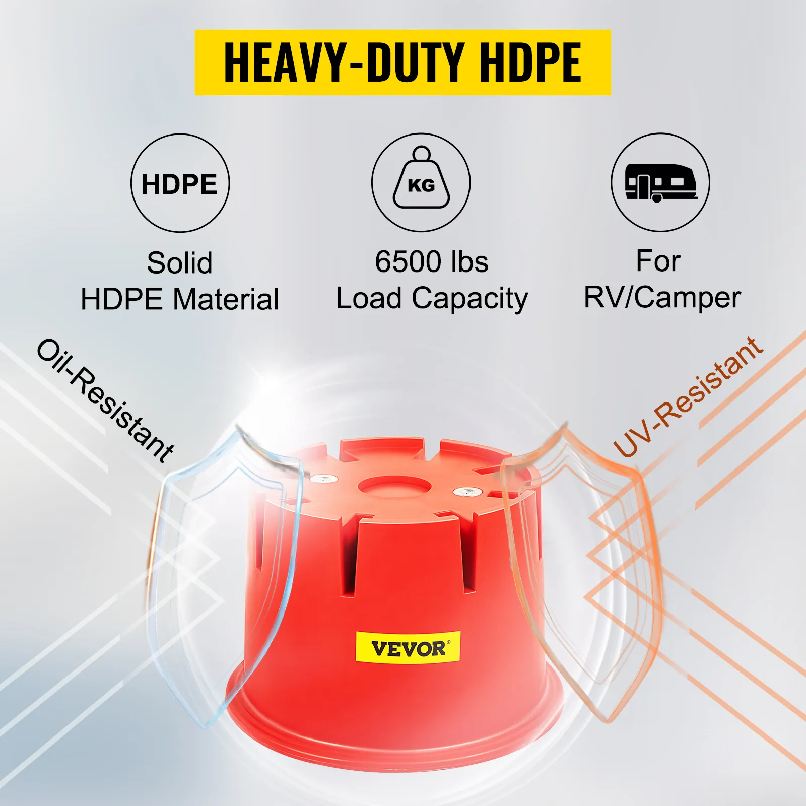 Made of ultra-tough high-density polyethylene, our trailer jack block can hold up to 6500 lbs/2949 kg of weight. It is dirt-proof, oil-resistant, and anti-UV, suitable for long-lasting use.