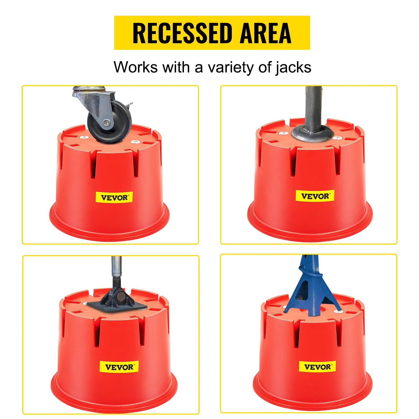 Recessed Area for Better Leveling: Recessed Pad Area: 9.13"/23.2 cm diameter; Recessed Post-Hole: 2.44"/6.2 cm diameter. They help prevent jacks from slipping and work with scissor jack, post jack, pad jack, tough jack, and more.