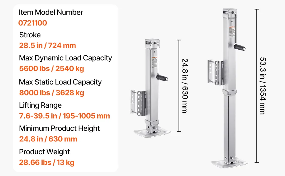 • Heavy-Duty Load Capacity: The trailer jack boasts an impressive static lifting capacity of 8000 lbs and dynamic lifting capacity of 5600 lbs, making it a powerful tool for lifting tasks. With a lifting range of 7.6 to 39.5 inches, it fits both high-profile and low-profile trailers.