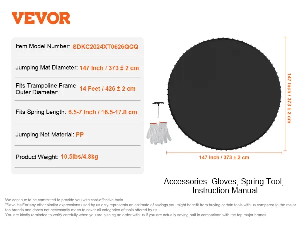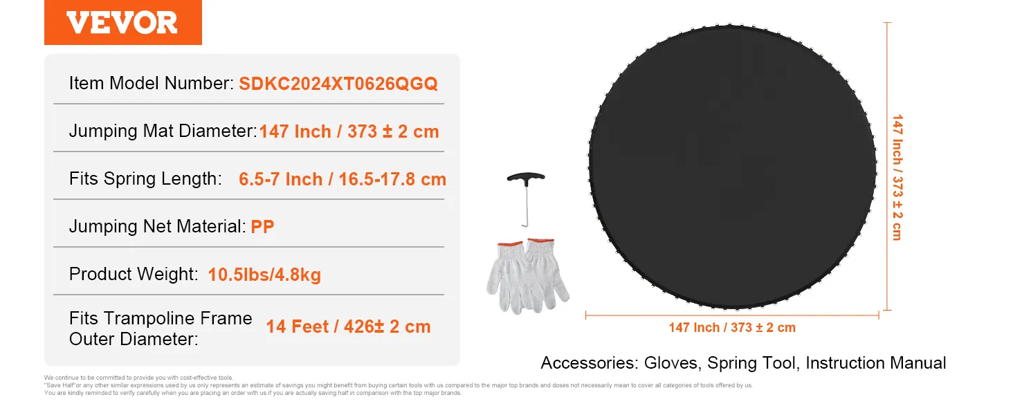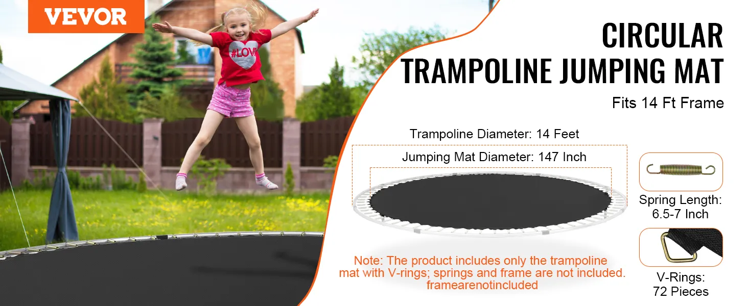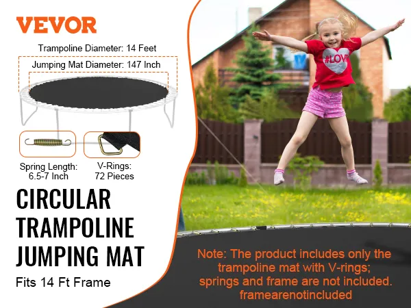 Fits Trampoline Size: The replacement trampoline mat is suitable for 14-foot round trampolines, with 72 V-rings, using 6.5-7 inch springs, and a mat diameter of 147 inch. Note: Frame and springs are not included.