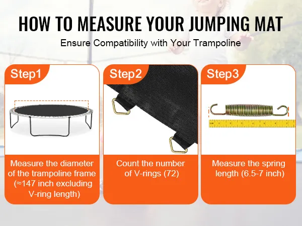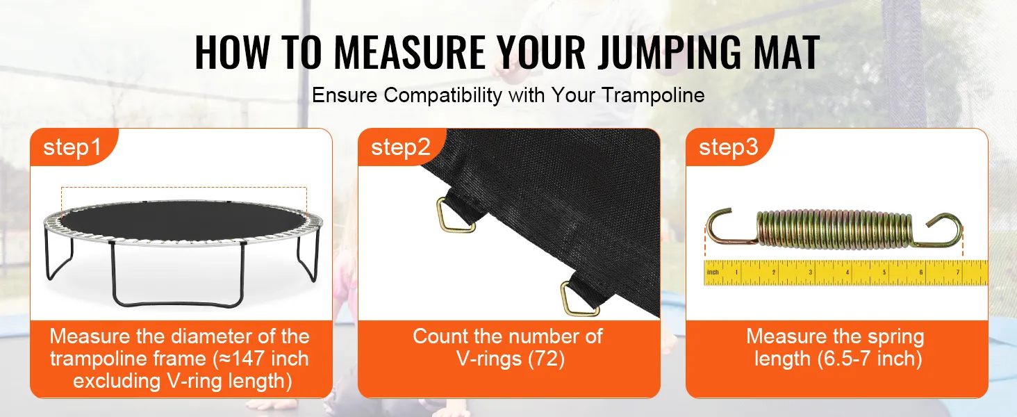 How to Measure: To determine compatibility: 1. Measure the diameter of the original trampoline mat. 2. Count the number of V-rings on the original trampoline. 3. Measure the spring length.