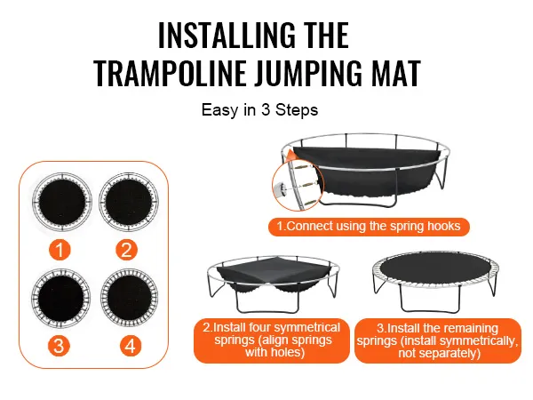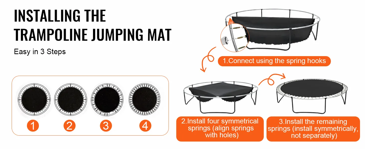 Jumping Mat Installation Tips: Start by installing the premium trampoline mat at 0°, 180°, 90°, and 270° positions, then evenly install the remaining springs.
