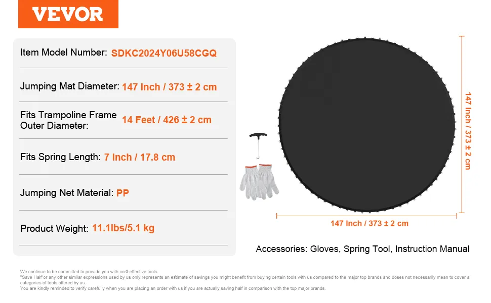 Fits Trampoline Size: The replacement trampoline mat is suitable for 14-foot round trampolines, with 96 V-rings, using 7-inch springs, and a mat diameter of 147 inch. Note: Frame and springs are not included.