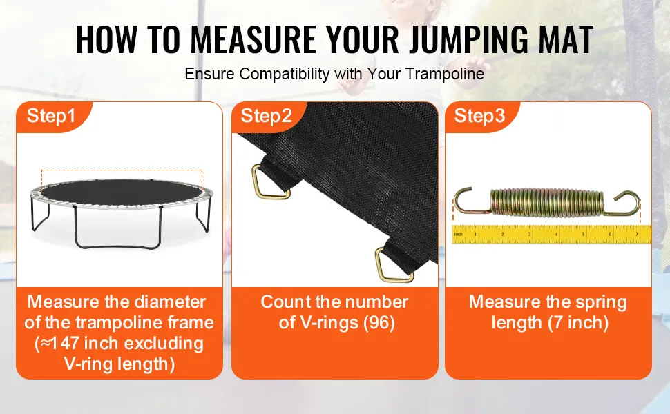 How to Measure: To determine compatibility: 1. Measure the diameter of the original trampoline mat. 2. Count the number of V-rings on the original trampoline. 3. Measure the spring length.
