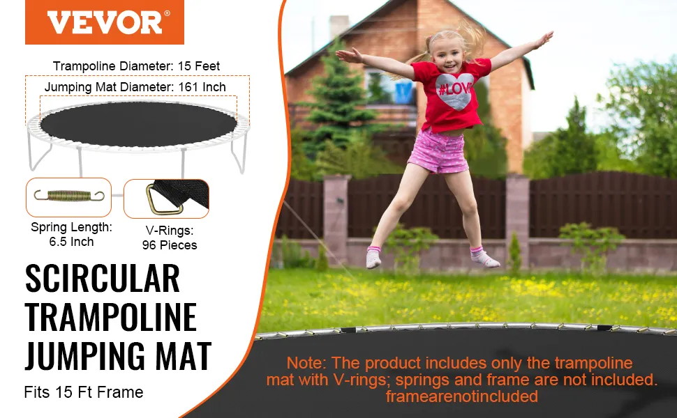 Fits Trampoline Size: The replacement trampoline mat is suitable for 15-foot round trampolines, with 96 V-rings, using 6.5-inch springs, and a mat diameter of 161 inch. Note: Frame and springs are not included.