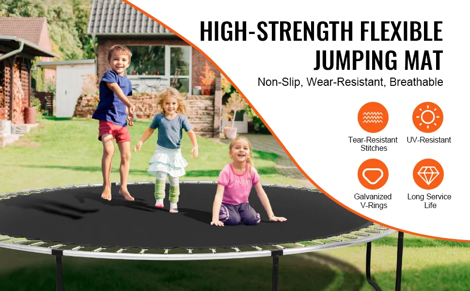 High-Quality Durable Material: Our trampoline jumping mat is made from PP material with a tightly woven construction, offering high strength, flexibility, anti-slip, wear resistance, and UV resistance for long-lasting use. It features thicker steel rings and higher stitch counts to ensure the V-rings are more secure.