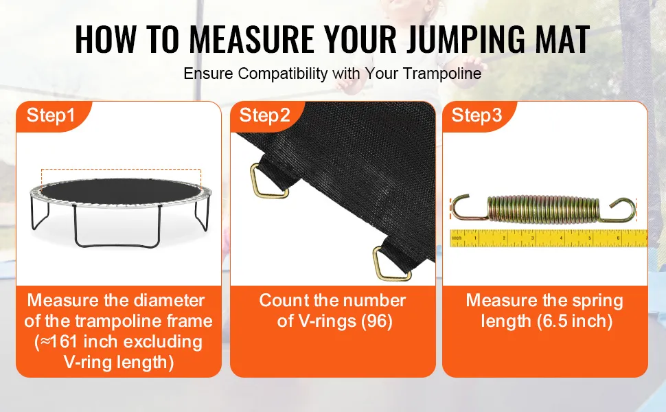 How to Measure: To determine compatibility: 1. Measure the diameter of the original trampoline mat. 2. Count the number of V-rings on the original trampoline. 3. Measure the spring length.