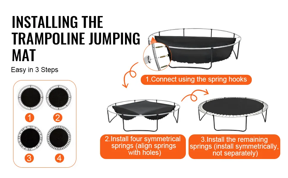 Jumping Mat Installation Tips: Start by installing the premium trampoline mat at 0°, 180°, 90°, and 270° positions, then evenly install the remaining springs.