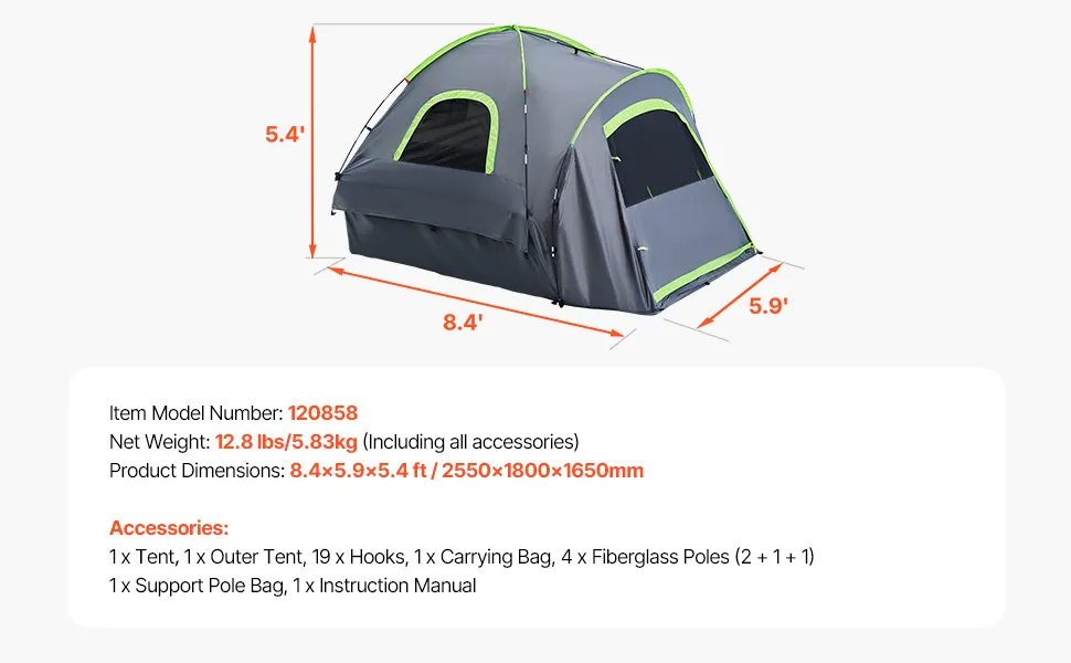 Fits 6.4-6.7ft Truck Beds: The truck tent size is 100.4 x 70.9 x 64.9 in / 2550 x 1800 x 1650 mm. Comfortable, spacious space for 2 adults and 1 child. You can sit upright without bending over, giving you a more comfortable outdoor camping experience.