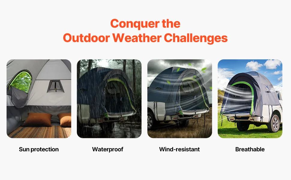 Waterproof & Durable: Our pickup truck tent is rated with a PU2000 waterproof level, keeping you dry even during heavy rain. Made with tough 210D Oxford fabric and tight stitching, this tent is tear-resistant and built to last.