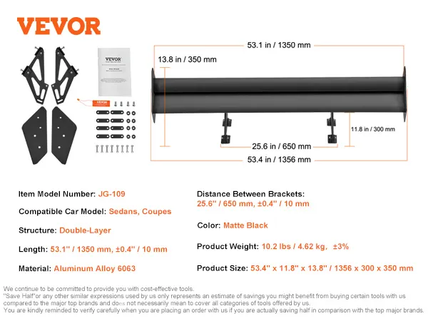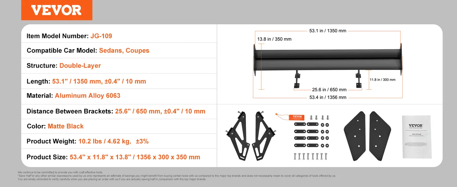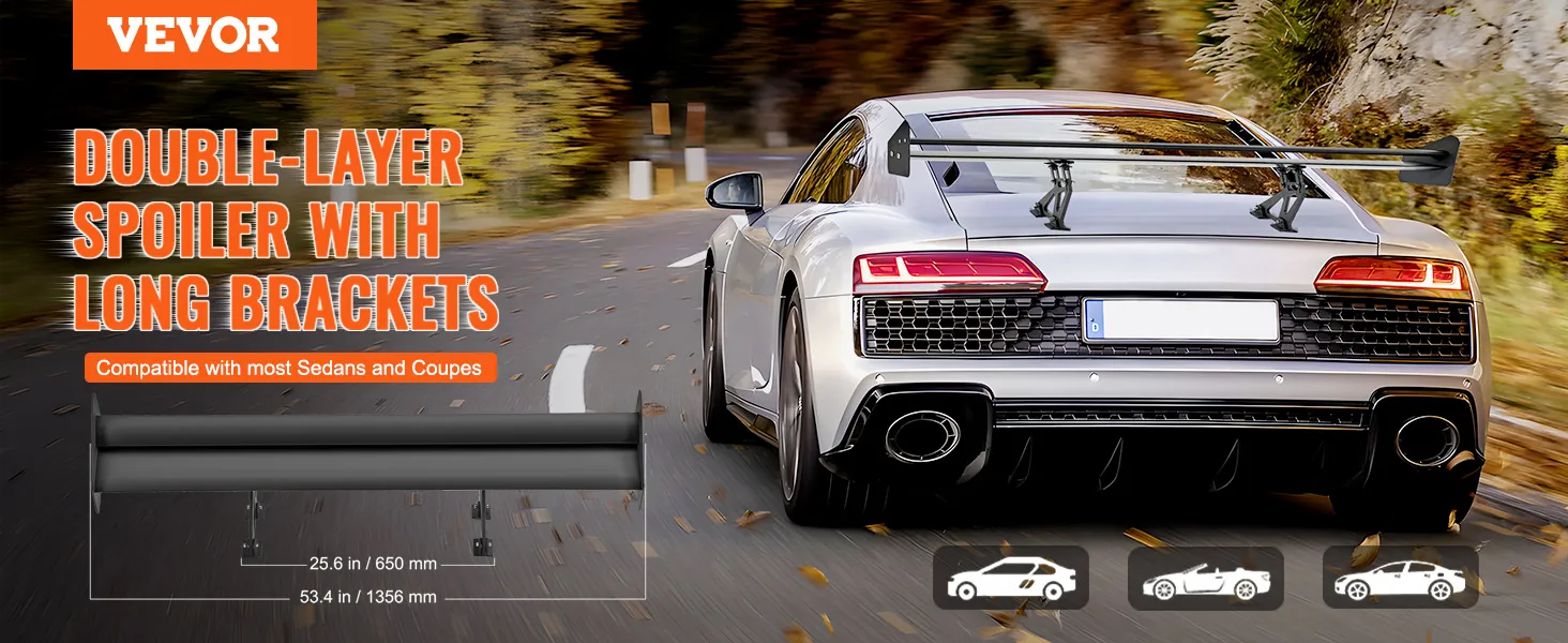 Universal Spoiler: Our rear spoiler is compatible with most sedans and coupes, with a standard spoiler length of 53.1" / 1350 mm and a distance of 25.6" / 650 mm between the two brackets. You don't need to worry about this spoiler not matching your beloved car. The dual-layer design is more suitable for high-performance or racing vehicles.