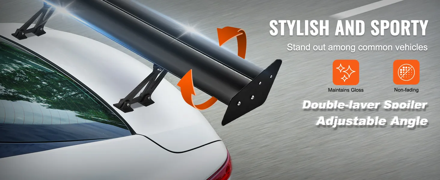 The VEVOR GT wing car spoiler has a stylish design. It uses a sprayed painting process to give it a premium matte texture. This texture doesn't fade or age, keeping it looking new for longer. The rugged, straight-line design adds a sleek look to your car. This spoiler will make your vehicle look like a Formula One racing car. Its adjustable bracket angle lets you customize the appearance. Enhance your automobile's look with this durable and stylish spoiler.
