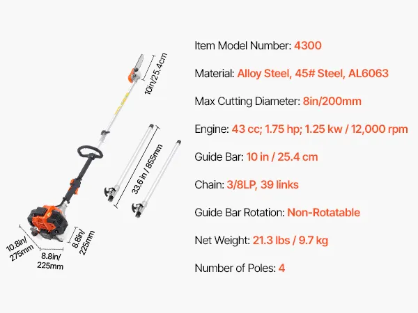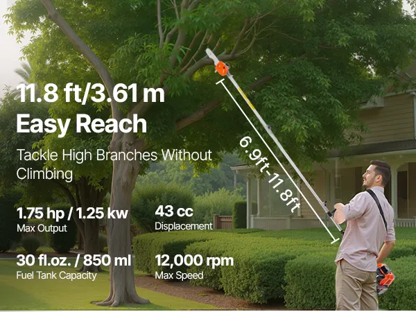 Powerful Performance: Equipped with a 43 cc 2-stroke gasoline engine, the gas pole saw delivers1.75 hp and a max speed of 12,000 RPM for efficient branch cutting. Includes two 33.7 in (85.5 cm) extension rods that extend from 6.9 ft (2.11 m) to 11.8 ft (3.61 m) for reaching high branches. The 90-180° adjustable cutting head handles different pruning angles.