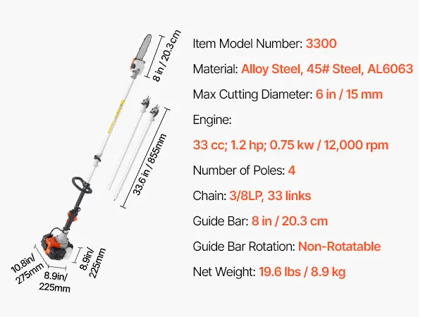 Powerful Performance: Powered by a 33 cc two-stroke gasoline engine, delivering 1.2 hp and reaching up to 12,000 RPM for fast branch cutting. The 2 stroke pole saw features one 33.7 in (85.5 cm) extension pole, extending from 6.7 ft (2.04 m) to 11.6 ft (3.54 m) to handle branches at various heights.