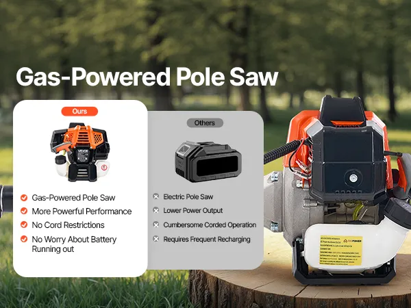 Equipped with a 33cc 2-stroke gasoline engine, gas powered pole saw delivers 0.75 kW of power and reaching up to 12,000 RPM, paired with an 8" (20.3 cm) guide bar for fast and efficient cutting. No need to worry about cord lengths or battery life, for higher cutting efficiency and stable operation.