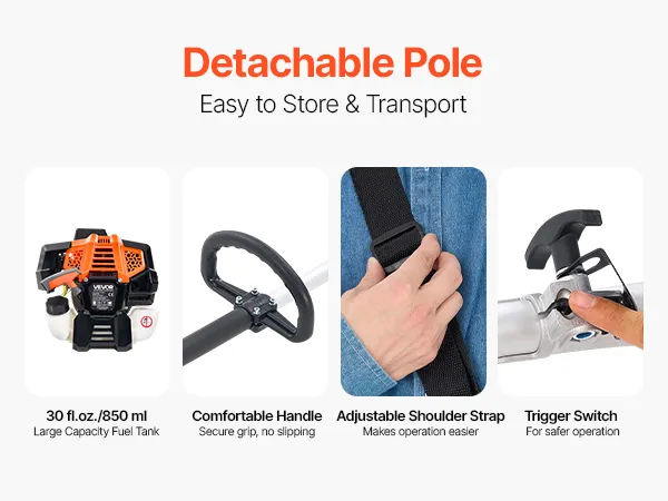 User-Friendly Operation: The gas pole saw comes with a 30 fl. oz. (850 ml) fuel tank for extended operation and 5.28 fl. oz. (150 ml) chain oil reservoir for smooth lubrication. The detachable extension pole reduces transport strain, while the lightweight design (19.6 lbs / 8.9 kg) with shoulder strap and anti-slip handle minimizes fatigue during long use.