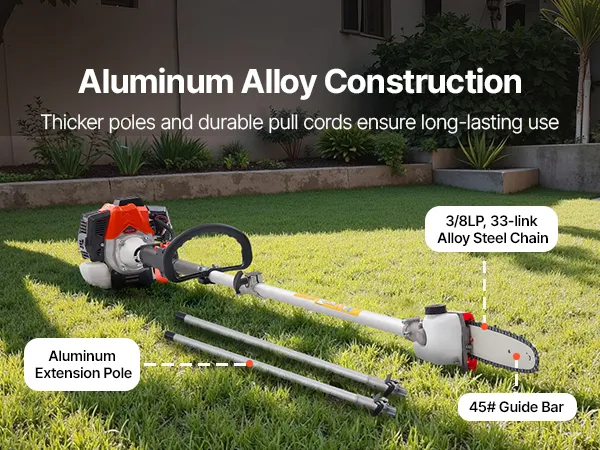 The pole is made of rust-resistant aluminum alloy to withstand various weather conditions. The steel guide bar and chain are built for durability, reducing replacement frequency and saving time and money.