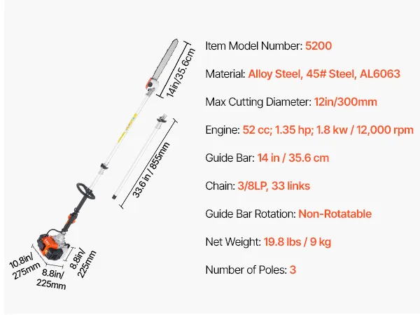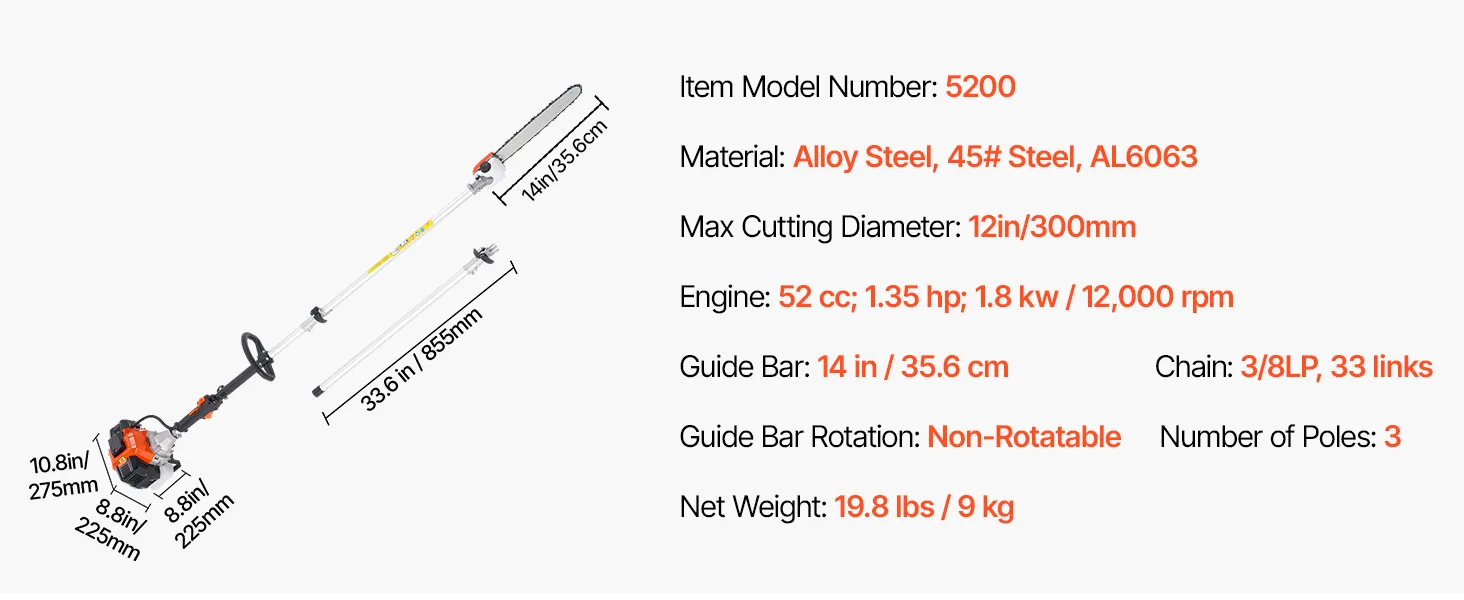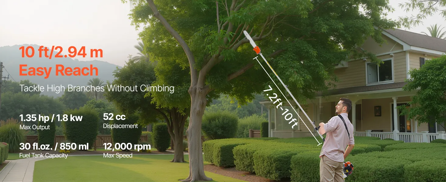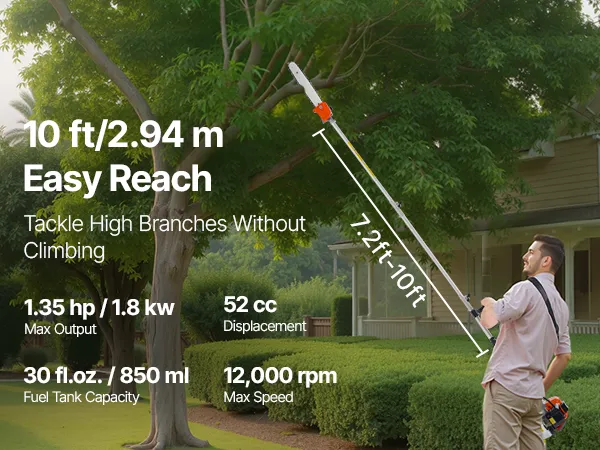 Powerful Performance: Equipped with a 52 cc 2-stroke gasoline engine, the gas pole saw delivers 1.35 hp and reaching up to 12,000 RPM, perfect for quick branch cutting. The two 33.7 in (85.5 cm) extension rods extend from 7.2 ft (2.2 m) to 10 ft (2.94 m) to tackle branches at various heights with ease.