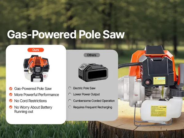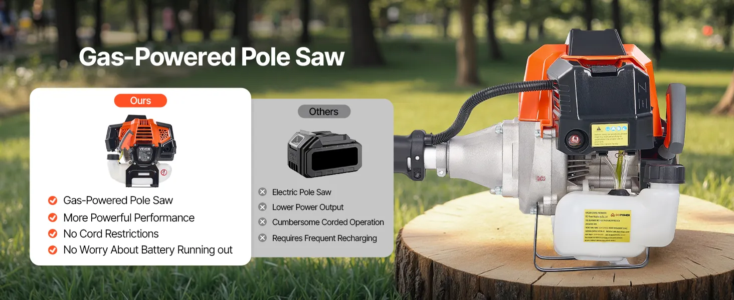 Equipped with a 52cc 2-stroke gasoline engine, gas powered pole saw delivers 1.8 kW of power and reaching up to 12,000 RPM, paired with a 14" (35.6 cm) guide bar for fast and efficient cutting. No need to worry about cord lengths or battery life, for higher cutting efficiency and stable operation.