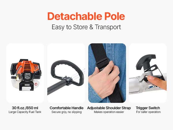 User-Friendly Operation: The cordless pole saw comes with a 30 fl.oz. (850 ml) fuel tank that offers extended operational time. A 5.28 fl.oz. (150 ml) chain oil reservoir ensures smooth lubrication. The detachable extension rod reduces transport burden, while the lightweight design (19.8 lbs / 9 kg) and ergonomic shoulder strap and anti-slip handle minimize fatigue during prolonged use.