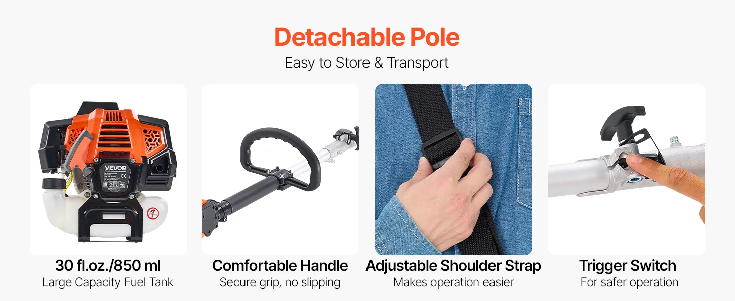 Complete Accessories: The includes the engine, extension rods, fuel tank rod, guide bar, chain, chainsaw cover, mixing bottle, protective components, shoulder strap, installation tools, and a detailed manual, making assembly a breeze.