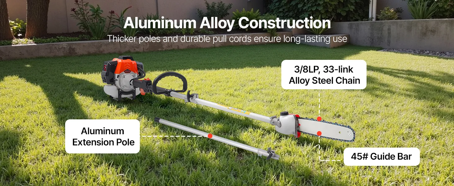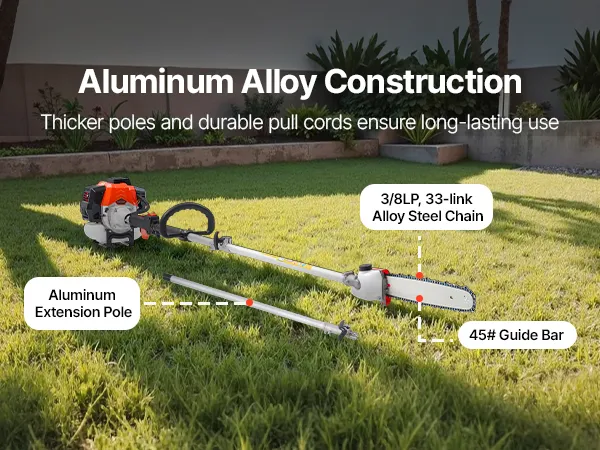 The pole is made of rust-resistant aluminum alloy to withstand various weather conditions. The steel guide bar and chain are built for durability, reducing replacement frequency and saving time and money.