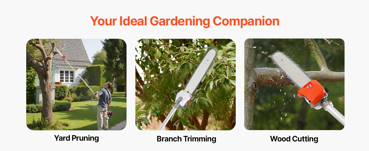 Wide Application: The chainsaw on pole is ideal for pruning backyard fruit trees, farm branch clearing, landscaping maintenance, and emergency firefighting. The cordless design allows for unrestricted outdoor use, enabling you to tackle any cutting task without limitations from power cords.