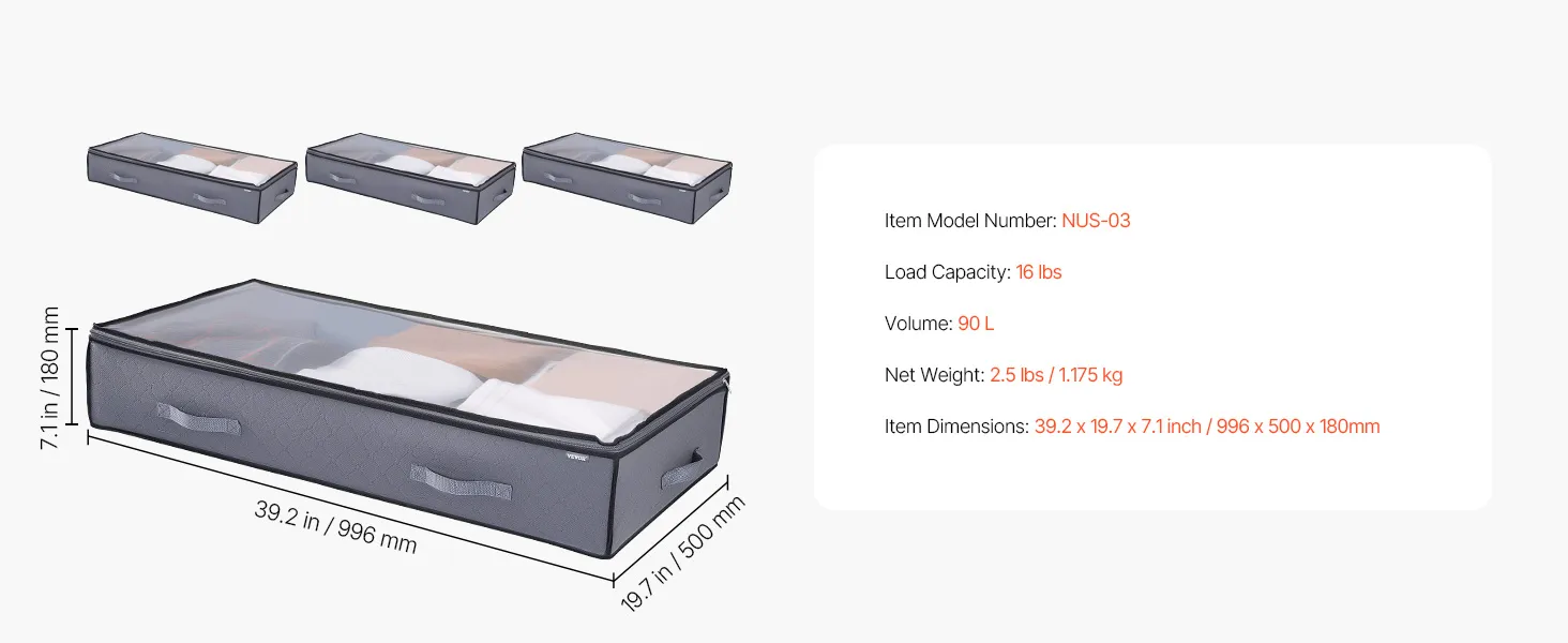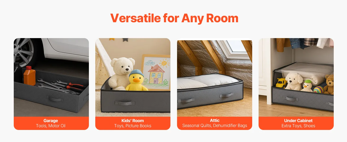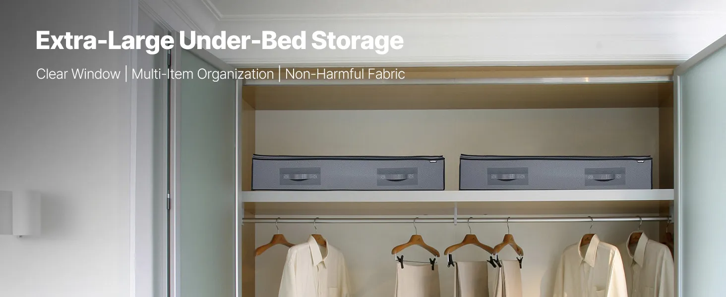 Our under bed storage serves households of all sizes and frequent movers. It optimizes space utilization by efficiently storing items, offering discreet organization with dustproof, anti-damp, high-load capacity, and easy mobility, delivering a modular storage solution tailored for compact spaces.