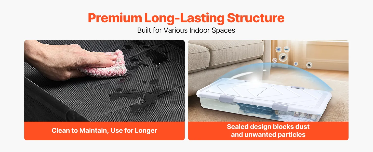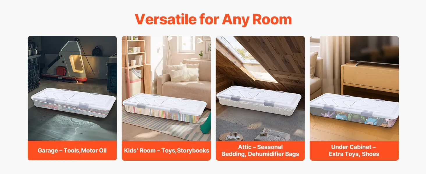 Our under bed storage serves households of all sizes and frequent movers. It optimizes space utilization by efficiently storing items, offering discreet organization with dustproof, anti-damp, high-load capacity, and easy mobility, delivering a modular storage solution tailored for compact spaces.