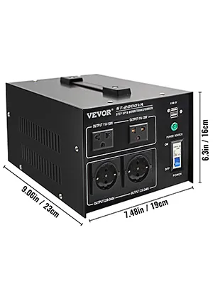 This step down transformer supports up to 2000W across multiple devices simultaneously. It can convert voltage from 220-240 Volts down to 110-120 Volts, and vice versa.