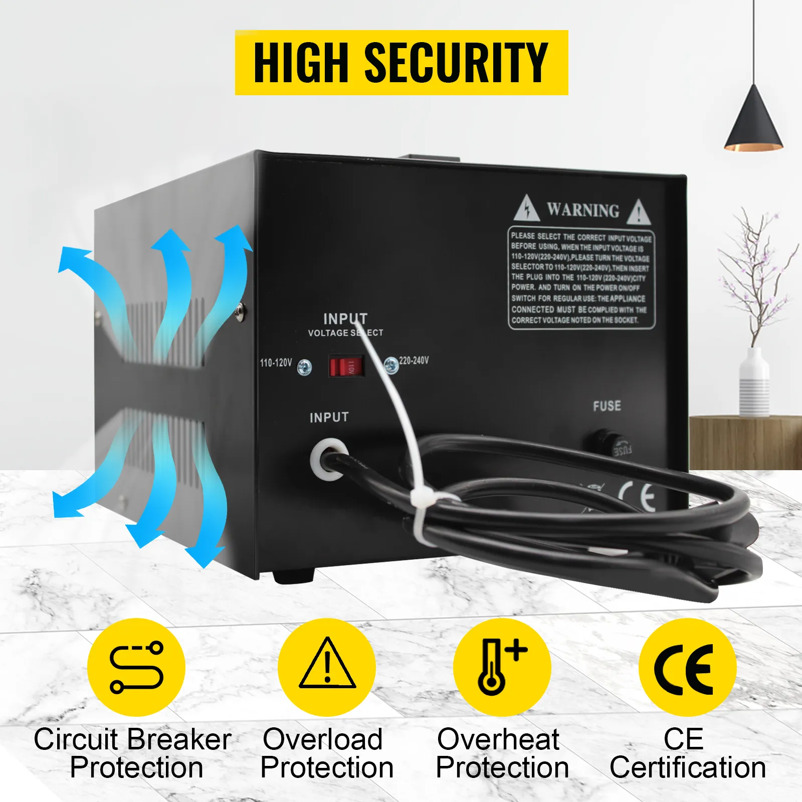 The step up step down voltage converter is equipped with a circuit breaker, overload protection, overheating protection, and CE certification, making users more secure during use.
