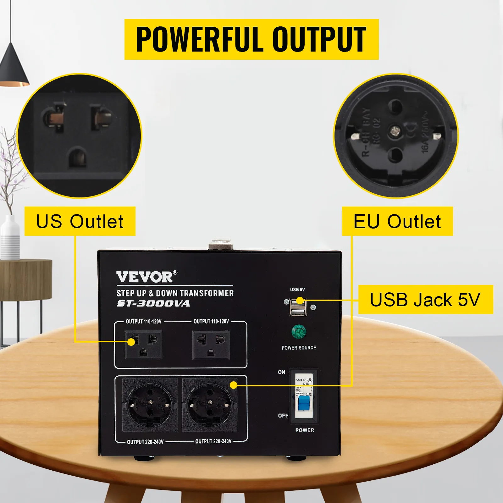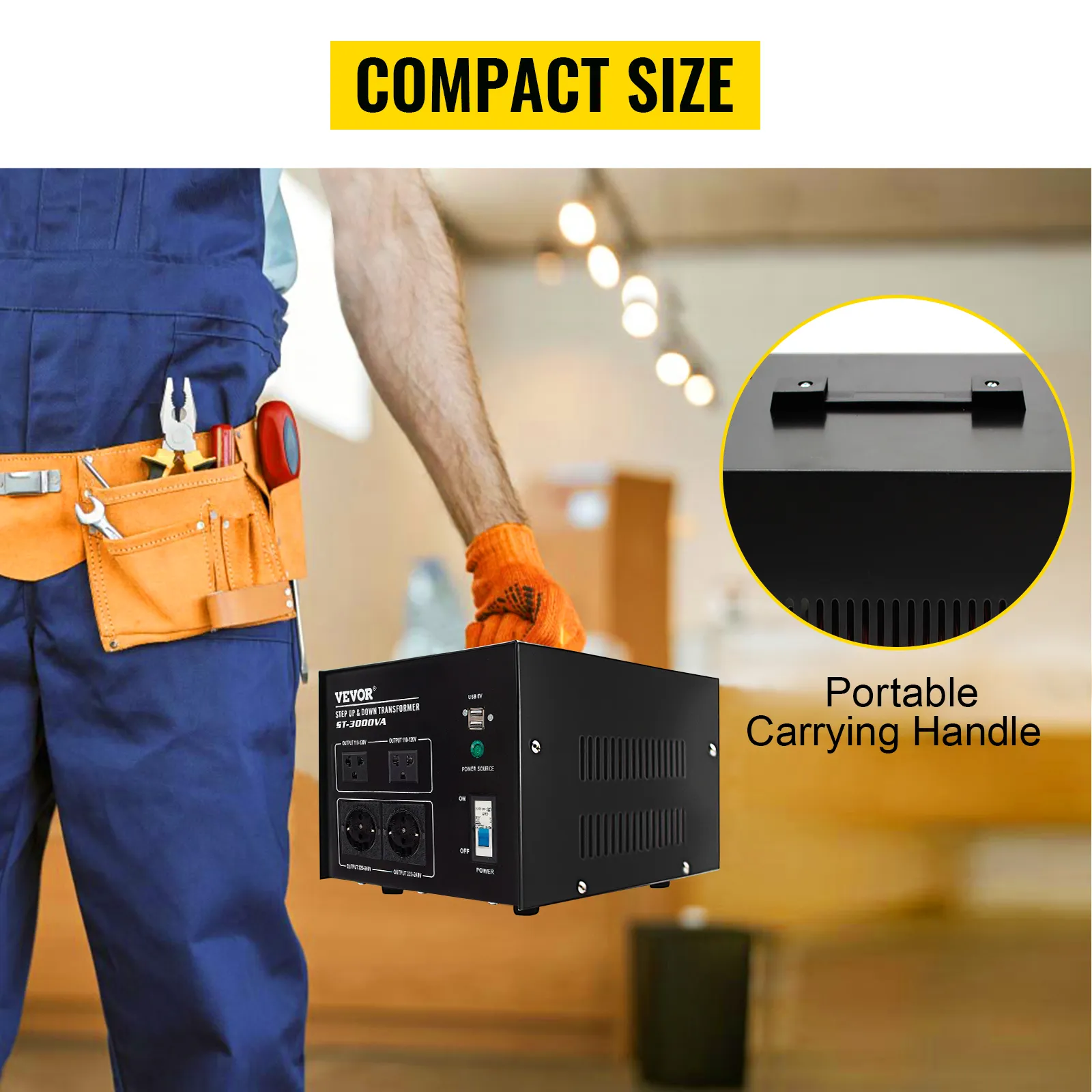 This step up & down transformer can convert 110V to 220V and vice versa, easily connecting to multiple electrical appliances at the same time. Equipped with 4 AC outlets, toroidal core technology, and multiple protections, our voltage transformer ensures stable output and high conversion efficiency. Charge up and get plugged in with VEVORs transformer.