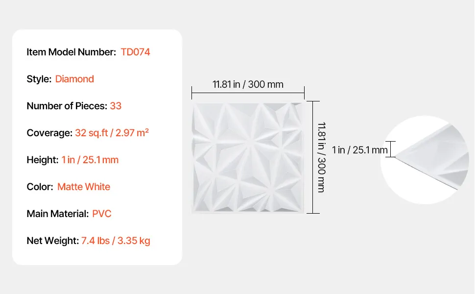 VEVOR 3D Wall Panels, 33-Pack 11.81 x 11.81 in PVC Modern Art Minimalist Diamond Tiles, 32 Sq.Ft Coverage Accent Wall Panel, Interior Home Decor for Ceiling, Bedroom, Living & Gaming Room, Matte White