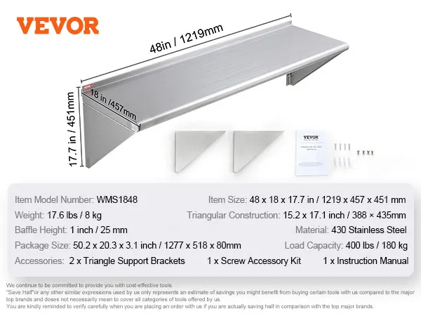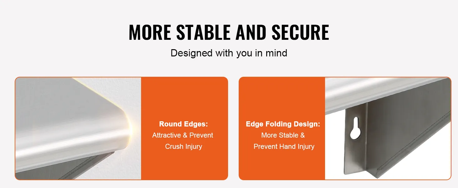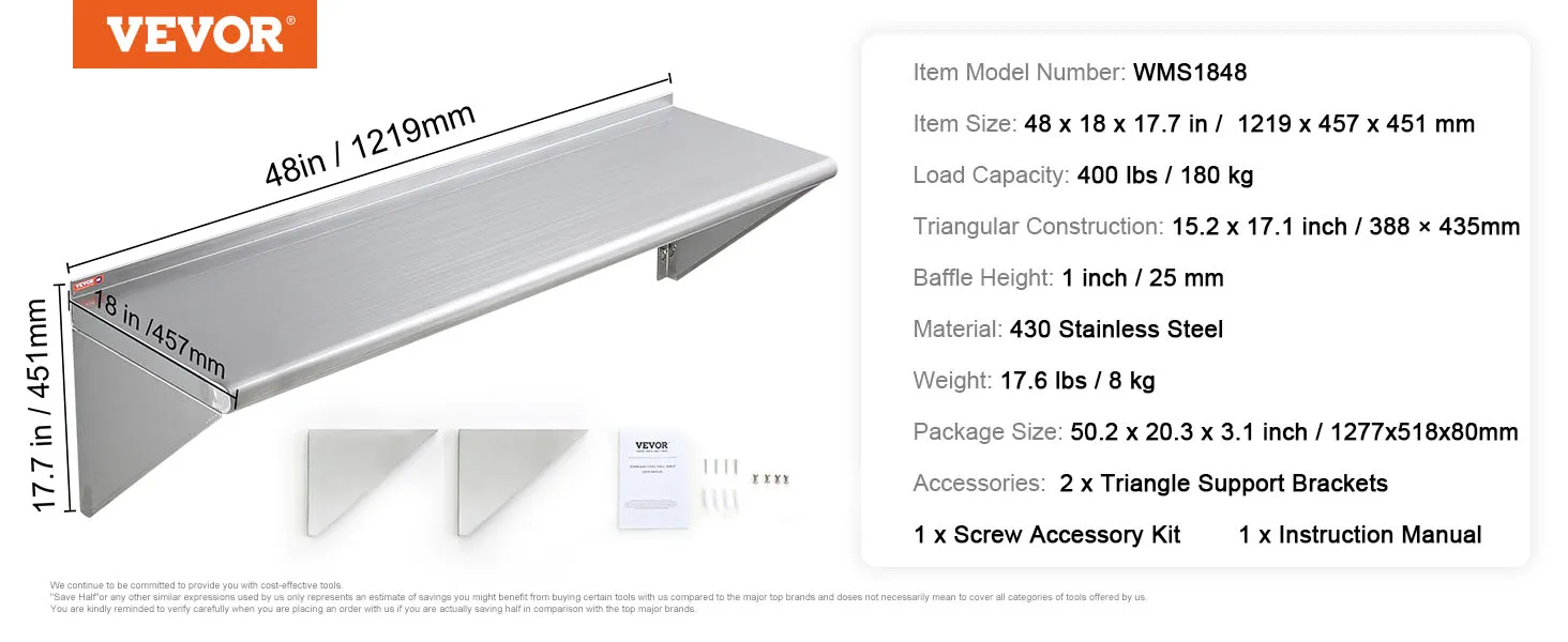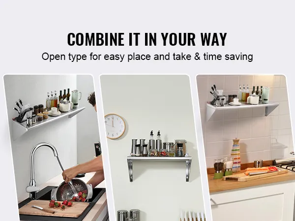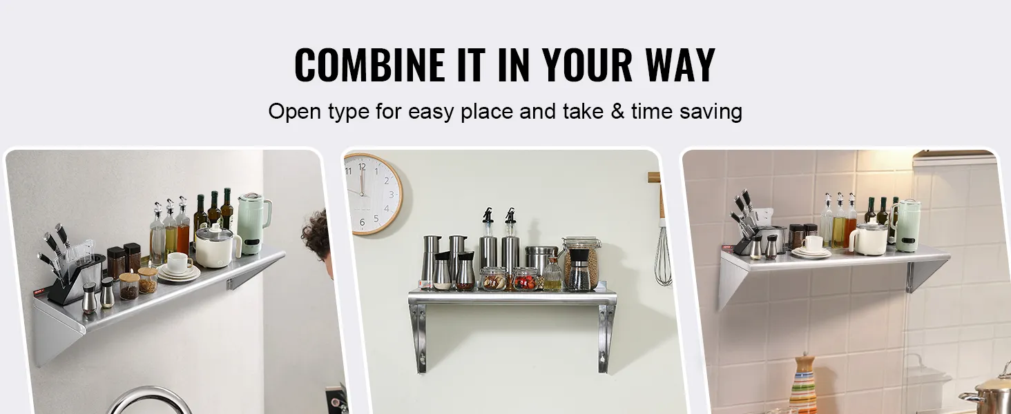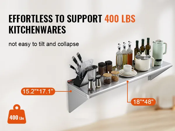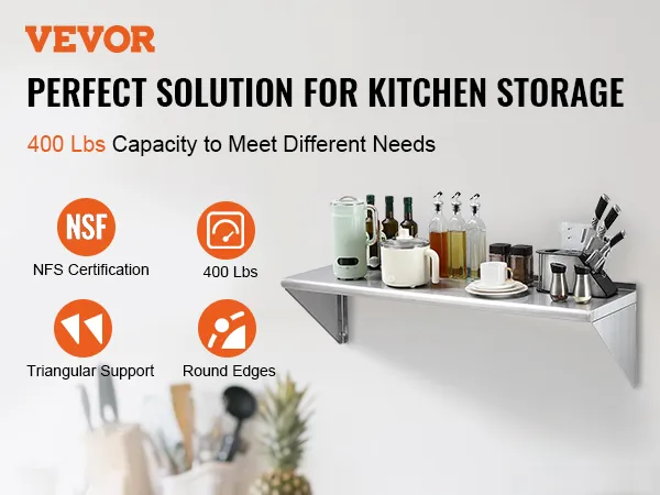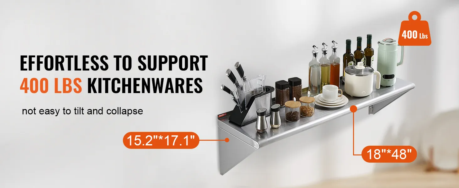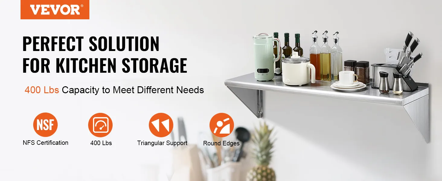 The VEVOR shelf is made of high-quality stainless steel. This ensures it lasts for a long time. The stainless steel stands out for its durability, strength, and resistance to rust and corrosion. It makes the shelf ideal for use in any environment. No matter if you install it in a tough kitchen setting or use it in your home, it remains sturdy and reliable. The durable construction ensures that it can handle heavy items without bending or breaking. These shelves are built to last, providing years of reliable use. High-quality materials make it a wise investment for anyone looking for long-term storage solutions.