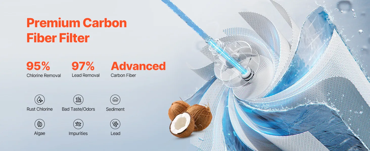 Equipped with a carbon fiber filter, it removes chlorine odor from water and effectively filters out contaminants, providing you with pure water.