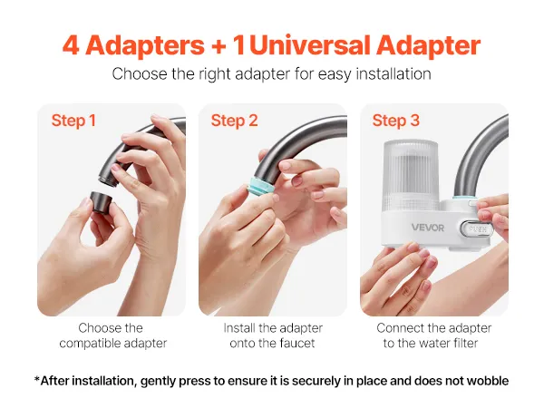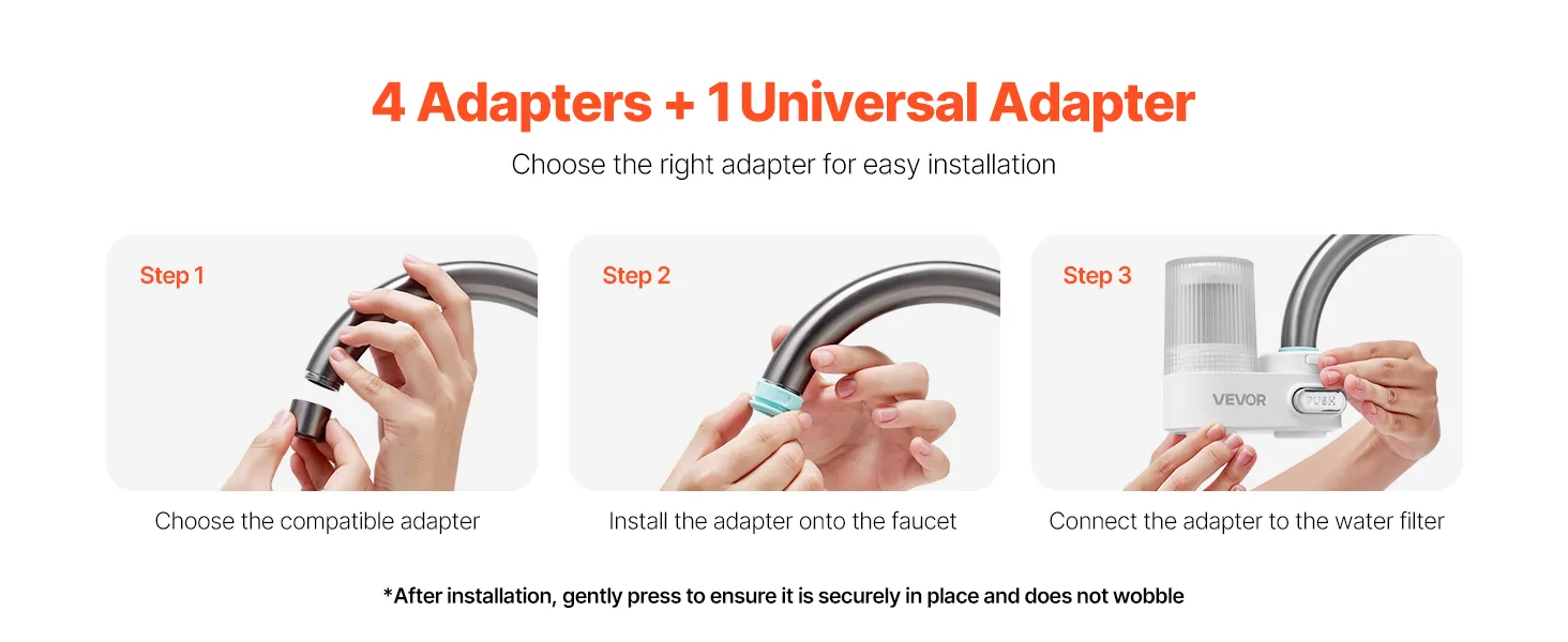 The sink water purifier includes 4 adapters and 1 universal adapter for easy selection. Choose the correct adapter, and you can easily complete the installation within 5 minutes.
