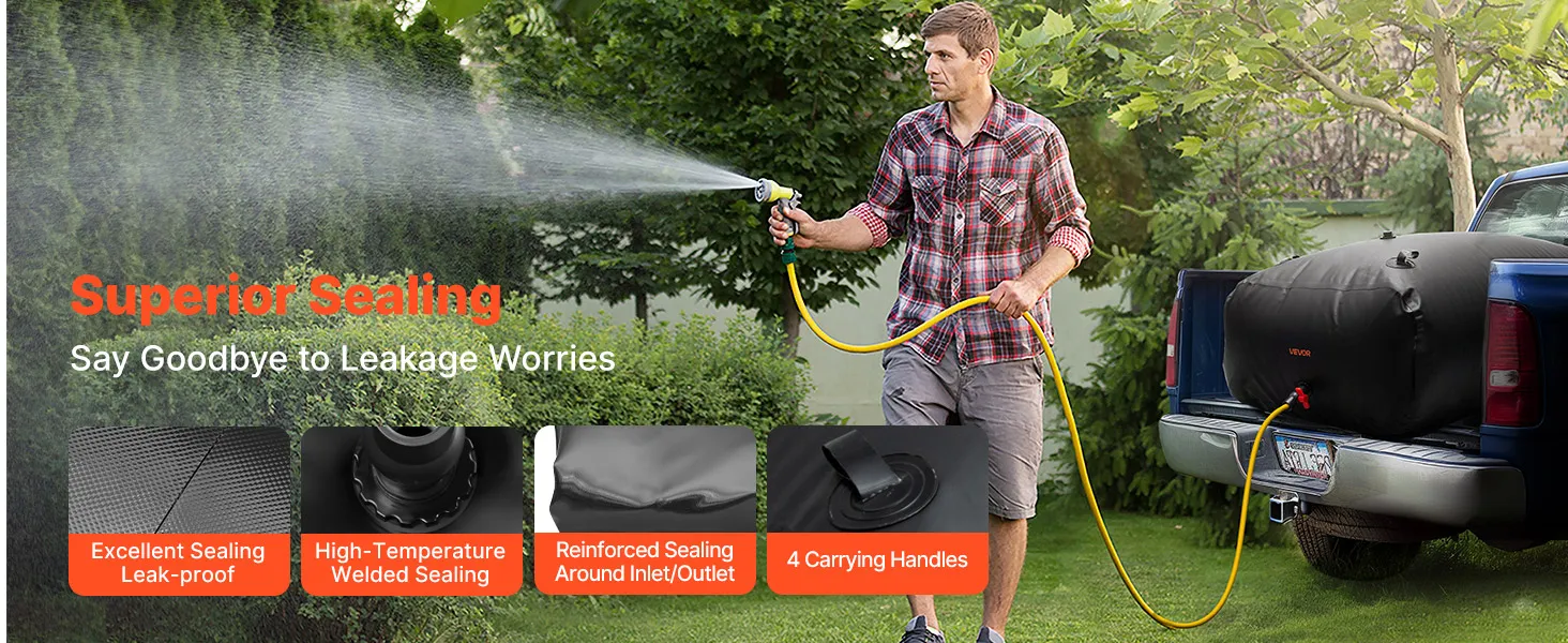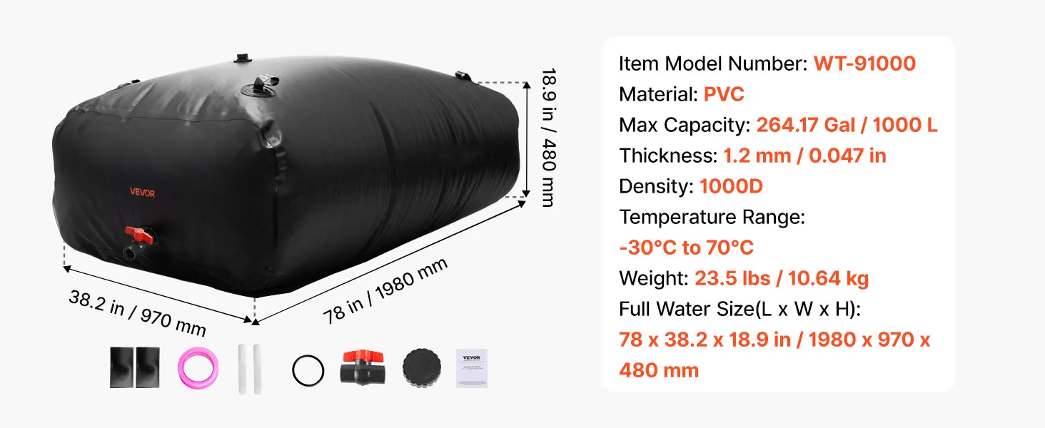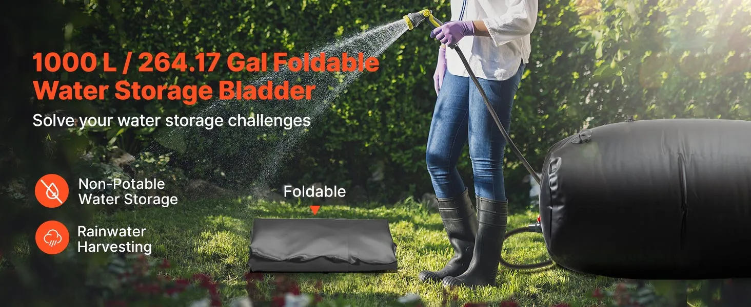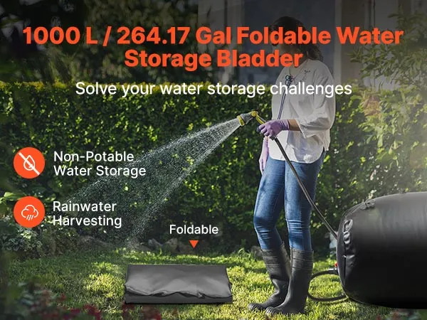 Extra-Large Capacity: Boasting a 264-gallon (1000L) extra-large capacity, this VEVOR water storage bladder is perfect for home use, extended outdoor camping trips, garden watering, RV setups, drought resistance, and emergency water supply. Foldable and portable, easy to take anywhere