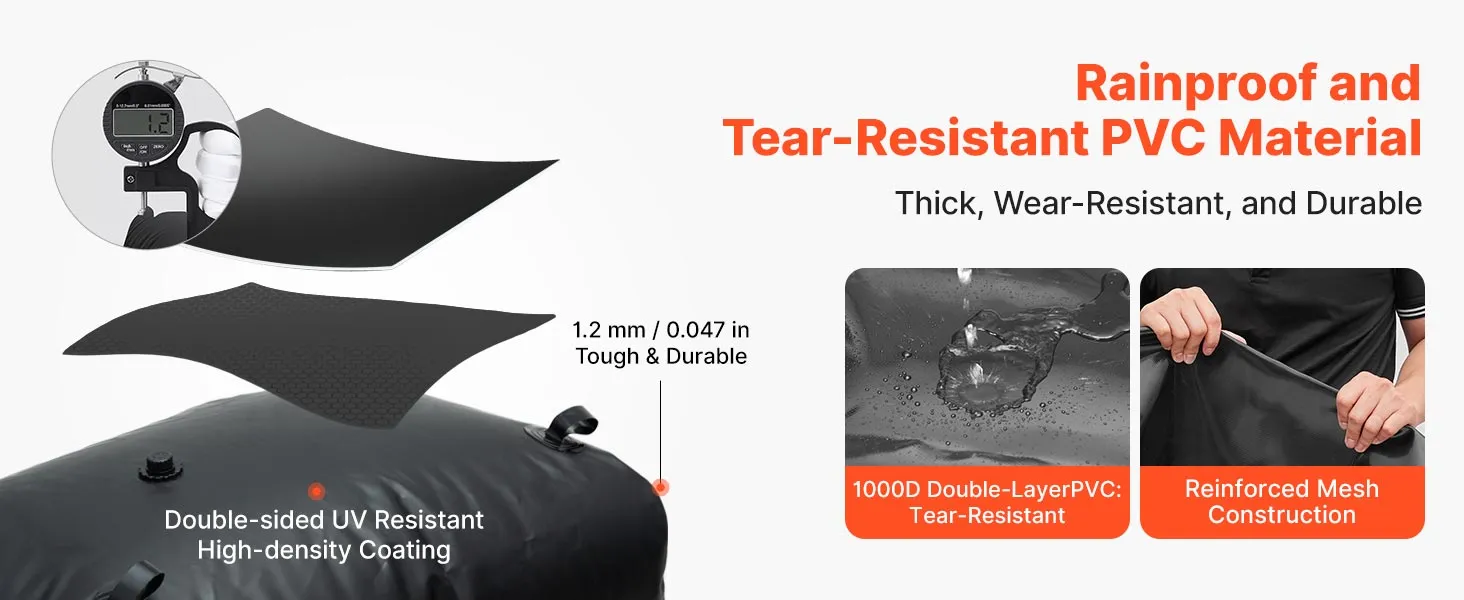 Made of durable 1000D double-layer PVC, this water storage tank is rainproof, flame-retardant, wear-resistant, and easy to mold, making it ideal for daily home use, outdoor activities, camping, and agricultural irrigation.